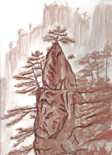 5月に訪れた中国の世界遺産黄山です。その中の「夢筆生花」という名所です。尖った岩の上に一本松が生えて筆を思わせるのでしょう。写真を見ながらすべて葦ペンで描こうと始めたのですが、難しいので途中から筆になりました。 |