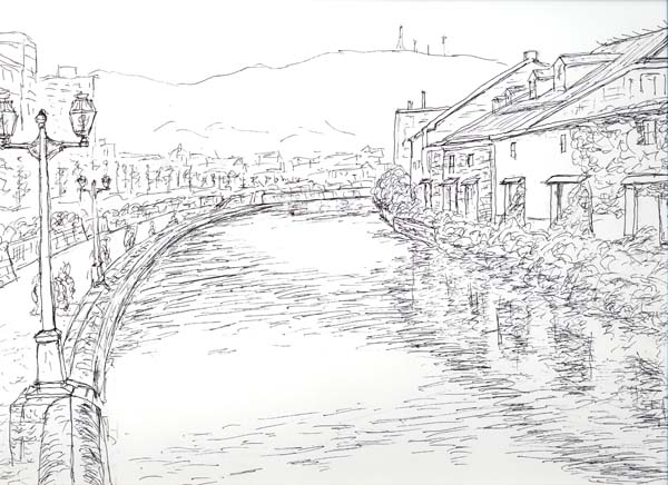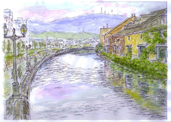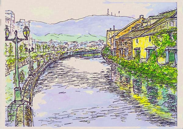 これは7月に訪れたご存じ小樽運河です。夕暮れの写真を見てペンで描きました。 |