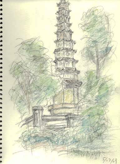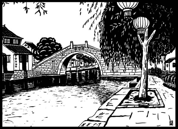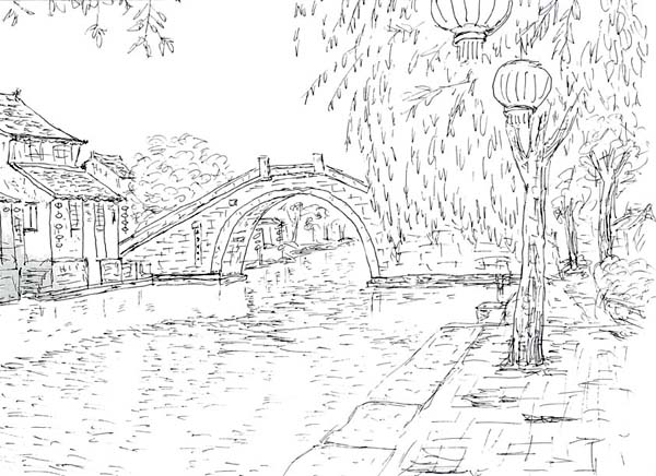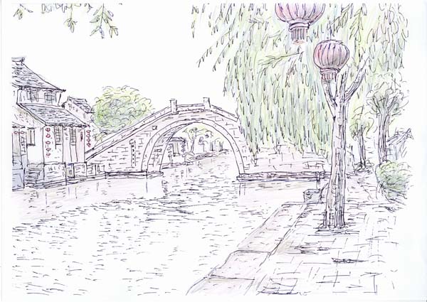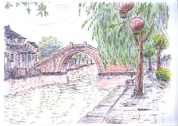 水郷西塘古鎮です。沢山ある橋の一つです。現地でスケッチもしたのですが、これは後で写真を見てペンで描きました。 |