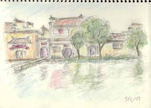 黄山麓の宏村。現地でのスケッチ。 |