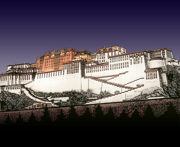 荘厳なポタラ宮の姿、いいですね。 空の色調などこの絵が一番いいです。複雑な建築物をよくここまで単純化しました。 下部斜めの線の下にある樹木は少し揃い過ぎましたね。前回も苦労されましたが左側2〜3本はこの線より上に突き抜けてもいいようです。 |
