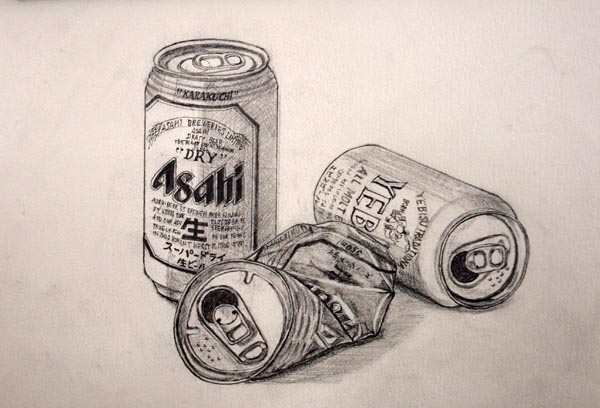 アサヒスーパードライ缶の作品、3点の中で一番存在感の或る好い作品です。 アルミの質感がよく出ていてモノクロで描いた効果がよく出ましたね。細かい所まで描いています。見る人を自然に右方向に回転させる動きを持った良い構図です。 3個の缶の中で中央のつぶれた缶をもっと強く描いて絵の中心を強調して下さい。 |