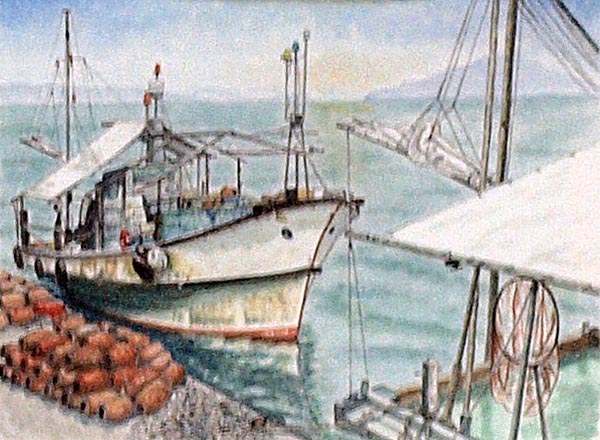船、港に接岸している情景がよく描けています。 船の白いテントや中央の灯火器具など、ほのかな旅情を憶えさせる良い作品です。右側手前の船もさらりと入れてあり、中央の船を盛り立てています。 これから船を描く時は心浮き立つ色を使ってください。 |