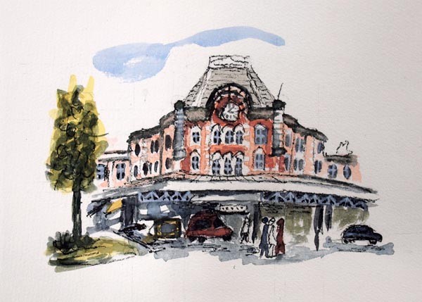 東京駅ですね。軽快に走る筆捌き、Goo!です。 この位置は北改札口だと思いますが時計塔の屋根まで一気に描き上げた構図は中々のものです。 この調子でどんどん描いて下さい。横田さん独特の軽快さが個性となって定着するでしょう。 |
